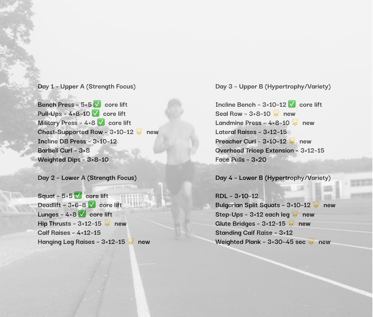 I’ve been running a 5-day strength split for about half a year. It’s worked, but with marathon training in full swing I need something more efficient. Plus, I like having a fresh set of movements to keep me motivated.